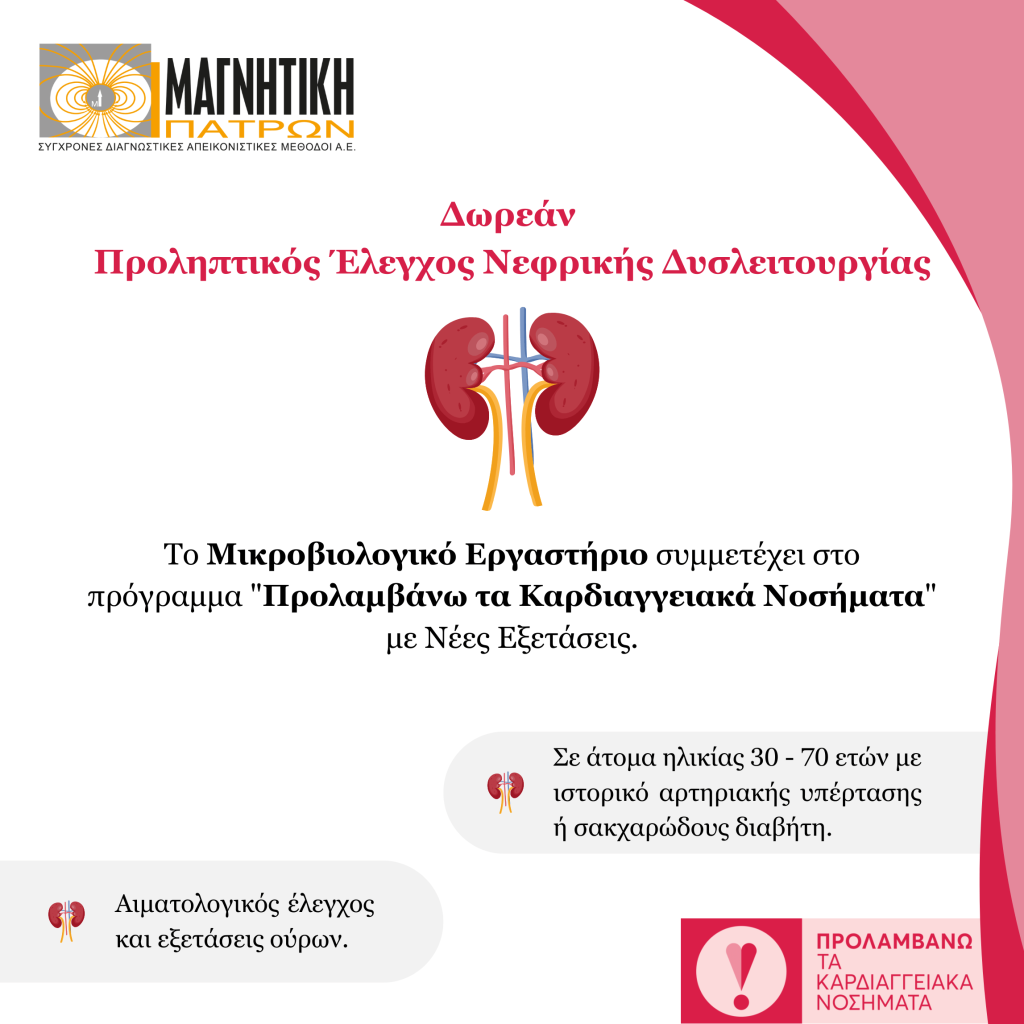 Για άτομα με ιστορικό αρτηριακής υπέρτασης ή σακχαρώδους διαβήτη, προστίθενται επιπλέον δωρέαν εξετάσεις για τον έλεγχο της νεφρικής λειτουργίας, καθώς η υγεία των νεφρών σχετίζεται άμεσα με τον καρδιαγγειακό κίνδυνο.
